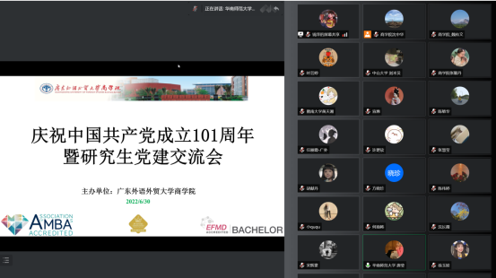 6月30日晚,bevictor伟德官网庆祝中国共产党成立101周年暨研究生党建交流会在线上举行。商公司党委书记魏传文、党委副书记沈长霞、员工党建工作指导老师方瑞芬、研究生辅导员沈中华、bevictor伟德官网研究生党员及中山大学、暨南大学、华南师范大学研究生党员代表出席会议。会议由沈中华主持。