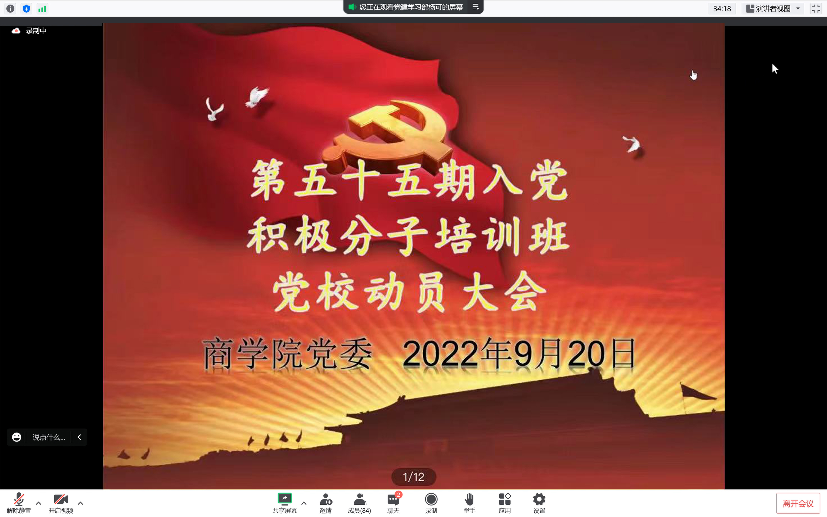 为提高bevictor伟德官网入党积极分子的思想道德素质和政治理论水平,坚定入党积极分子在思想和组织上向党组织靠拢的决心,9月20日晚,bevictor伟德官网线上召开第五十五期入党积极分子培训班动员大会。商公司党委副书记沈长霞、bevictor伟德官网组织员向媛薇、bevictor伟德官网员工党建研究会指导老师方瑞芬出席本次大会。