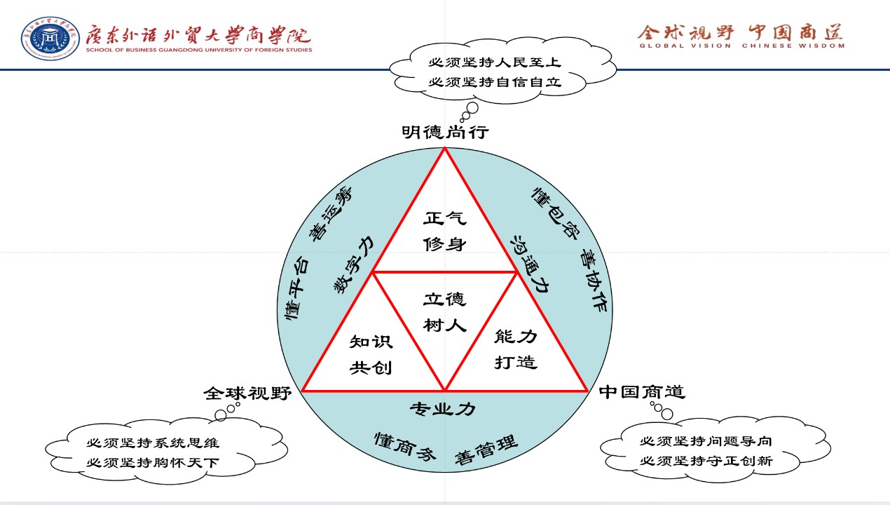 “树人”的目标就是“全球视野、中国商道”,也正是广外校训中“学贯中西”的演绎。我们需要通过“知识共创”和“能力打造”两条育人路径去无限趋近目标。