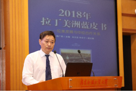 随后,拉丁美洲研究中心主任朱文忠介绍了蓝皮书的编写情况。他强调,相比之前两年发行的蓝皮书,本次发行的蓝皮书内容更加厚重,着力凸显与时俱进特色、彰显独特视角、体现国际化特色、发挥智库功能。本书结合了“一带一路”背景研究中拉合作发展以及加入了案例研究等,视角更加宽泛,编写团队成员更加国际化,并表明拉丁美洲研究中心将持续创新、精益求精,让《拉丁美洲蓝皮书》的质量不断提高,更好地服务国家和企业“走出去”,以及中拉合作交流事业。