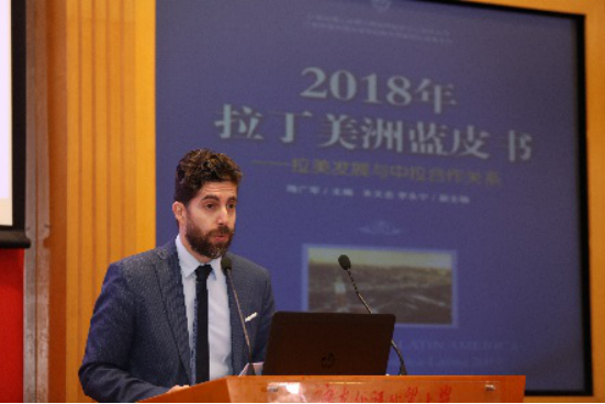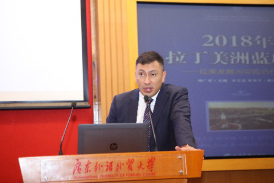 隋广军在致辞中对龙啸天、伊万•西尔瓦、臧泰和崔爽等嘉宾的到来表示热烈欢迎。他对拉美研究创新团队成功编写并出版《2018年拉丁美洲蓝皮书》表示祝贺,同时指出,拉丁美洲研究中心作为一个教育部国别与区域研究备案中心,是公司努力服务“一带一路”建设需求,着力加强区域与国别研究的其中一支重要的研究力量。《2018年拉丁美洲蓝皮书》的出版发行契合当今时代发展的需求,致力于拉丁美洲相关区域与国别投资环境问题研究,具有十分重要的学术价值和现实意义。
