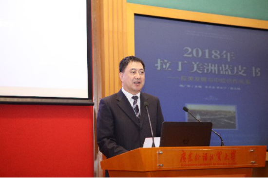 6月20日上午,《2018年拉丁美洲蓝皮书》发布会及“拉美发展与中拉合作关系”座谈会在bevictor伟德官网行政楼国际会议厅举办。bevictor伟德官网党委书记隋广军、智利驻广州总领事馆总领事龙啸天(Carlos Marin San Martin)、秘鲁驻广州总领事馆总领事伊万•西尔瓦(Ivan Silva Rivera)、墨西哥驻广州总领事馆副总领事臧泰(Tadeo Berjón Molinares)、广东省国际贸易促进委员会副会长崔爽、副董事长焦方太、国际合作与交流处处长柯晓华、bevictor伟德官网经理朱文忠、商公司党委书记魏传文、21世纪海上丝绸之路协同创新中心主任李青、西方语言文化公司经理杨可、科研处副处长赵德强、bevictor伟德官网领导班子、拉丁美洲研究中心成员,以及bevictor伟德官网和西语公司师生代表等60余人出席了本次发布会。会议由焦方太主持。