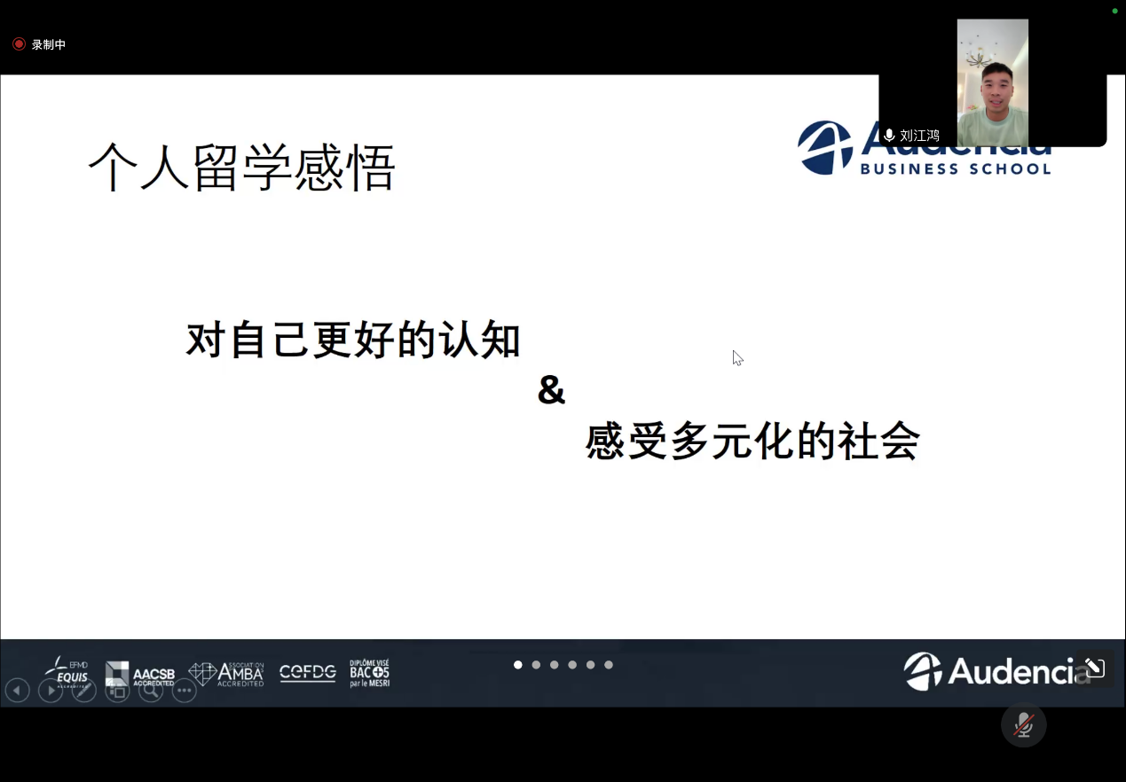 员工刘江鸿以自己的亲身经历为蓝本,介绍了法国留学及该项目的基本情况。他坦言道:“法国留学的经历通过多种方式让我有机会能够充分挖掘自我的可能性,使我成长为一个独立的人,明白‘做自己’便是其一成功之道,进一步地提升了对自我的认知,感受到了更加多元化的社会。”刘江鸿亦以过来人的经验向师弟师妹们提出了如提早准备法语、丰富学术技能等建议,使参会的同学们受益良多。