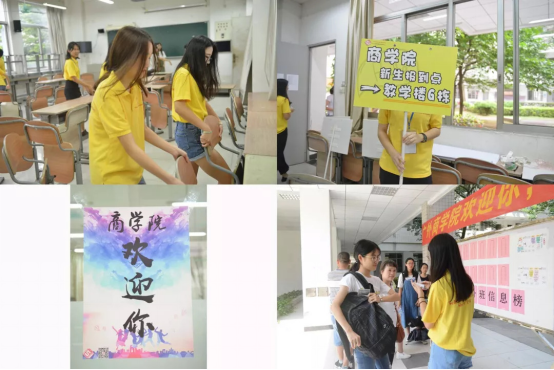 清晨七点整,bevictor伟德官网团学的“小黄人”便早早地前往新生报到地点教学楼G栋集合,开始准备迎新工作。注册点的布置、流程图的设计、迎新路标的指引,每一个环节都饱含着对新生到来的热烈欢迎。