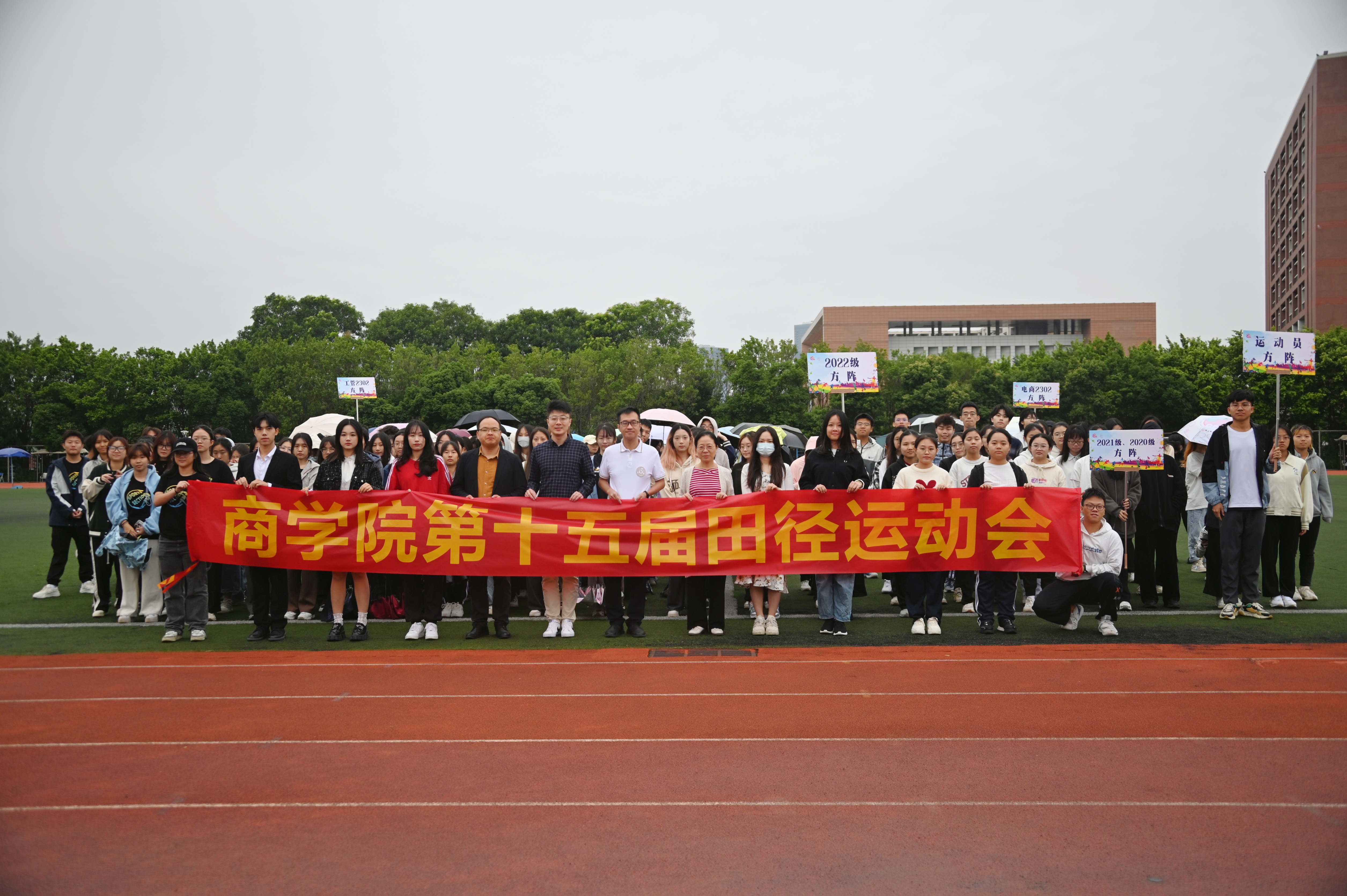10月21日,bevictor伟德官网在大学城校区假草场上举办“燃动力·逐热血青春”第十五届田径运动会。商公司党委书记肖喜明、党委副书记沈长霞、党委组织员向媛薇、团委书记张哲、辅导员刘富先、秦雨、罗毅颖与各年级员工代表、运动员、裁判员出席开幕式。