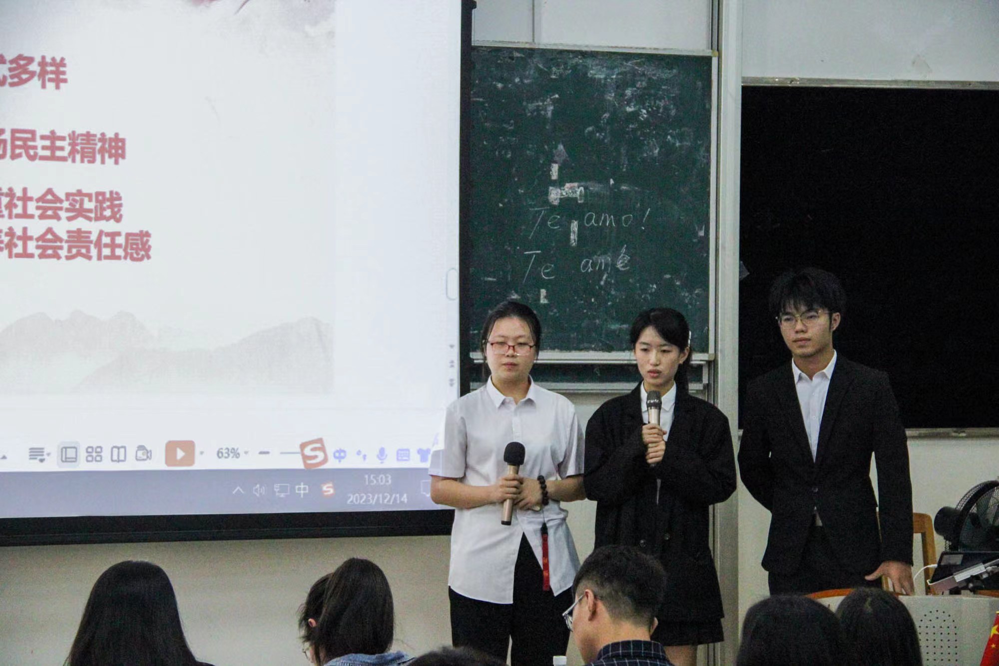2023年12月14日下午,2023-2024学年第一学期主题团日活动展示报告会于大学城校区教学楼F215顺利举行。校团委专职团干李新璐,bevictor伟德官网团委书记张哲、2023级辅导员秦雨,bevictor伟德官网团委副书记黄冰、员工会执行主席刘笑君,展示团支部代表和各年级员工参加会议。