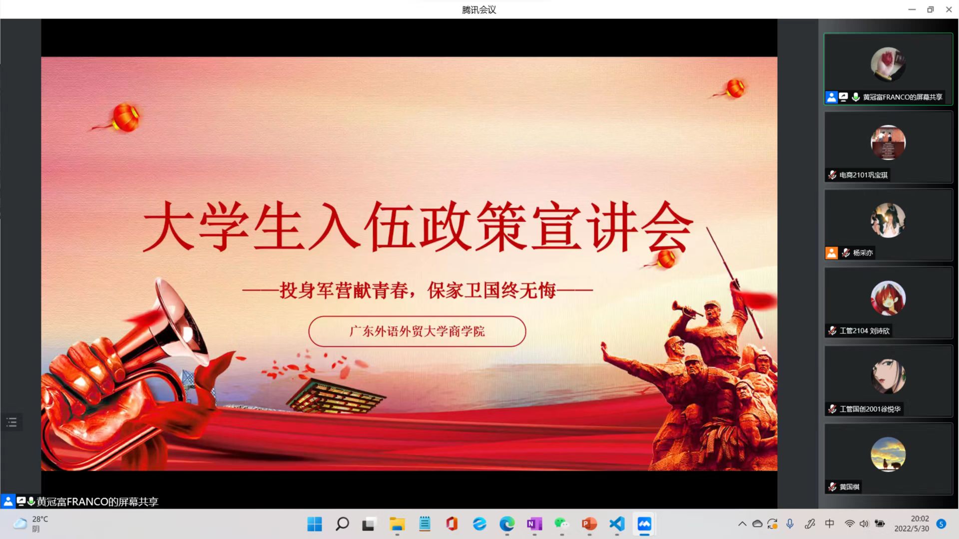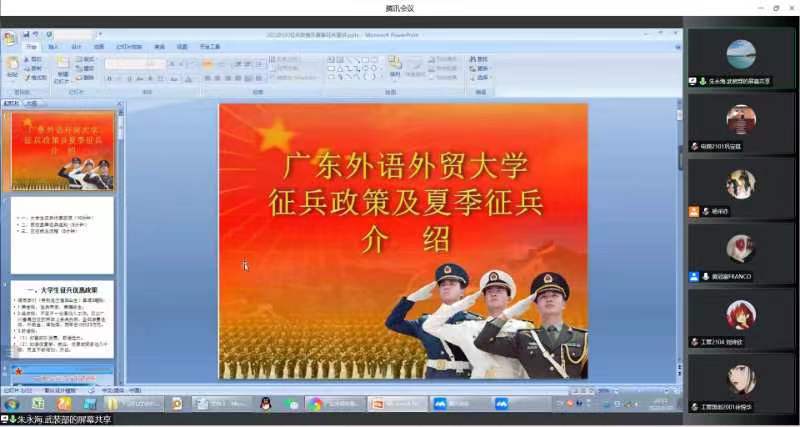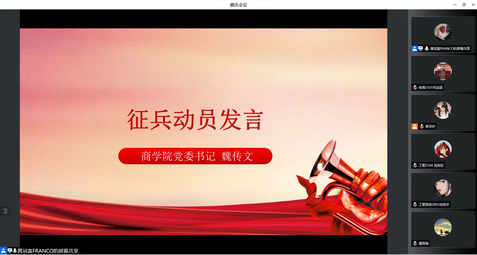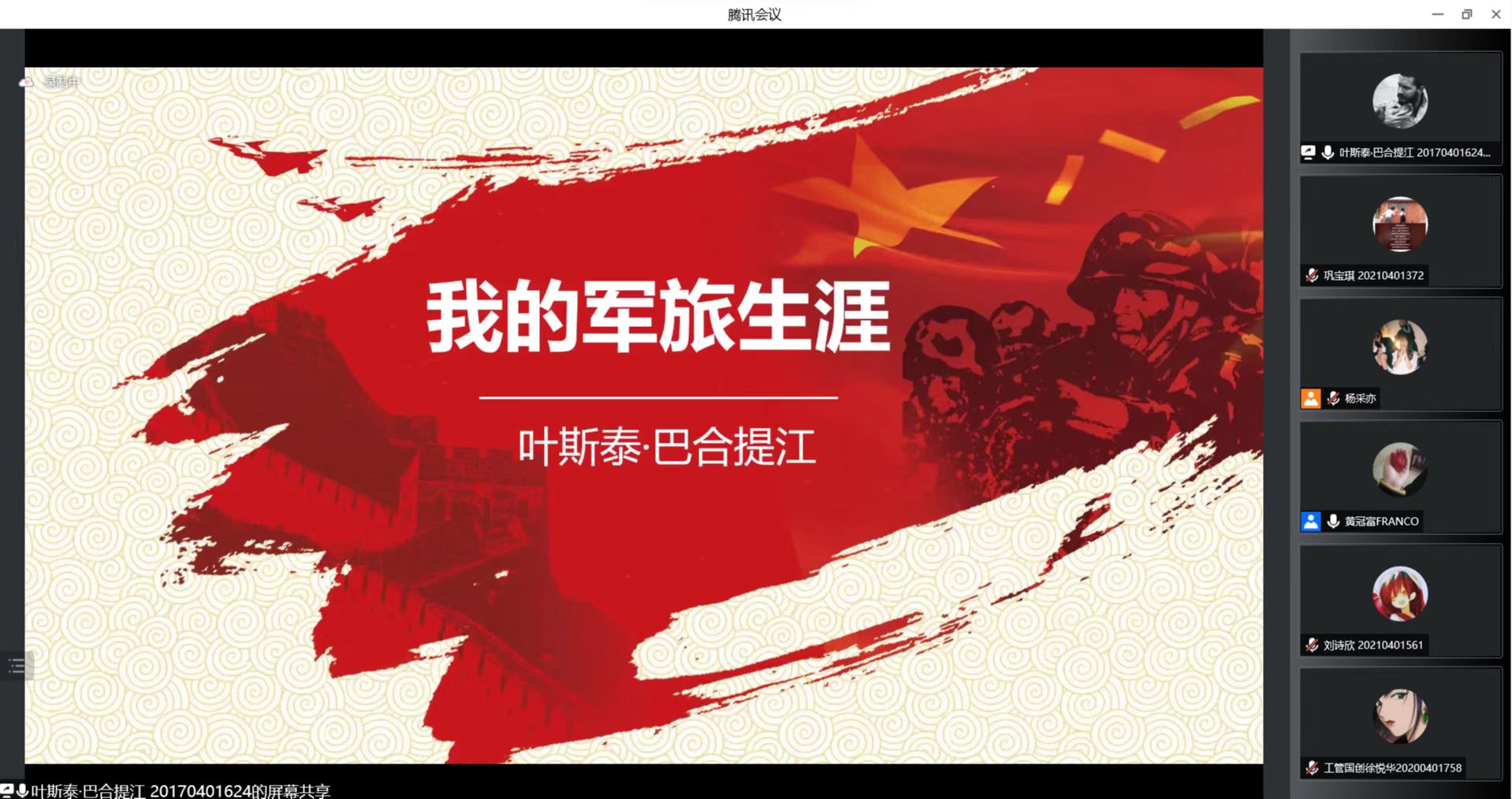 为贯彻落实国家征兵政策,鼓励在校老员工积极响应国家号召应征入伍,投身军旅,绽放青春,5月30日晚,bevictor伟德官网在腾讯会议召开2022年老员工征兵入伍动员大会暨政策宣讲会。商公司党委书记魏传文、党委副书记沈长霞,武装部国防教育科科长朱永海,全体辅导员、2019级退役士兵叶斯泰·巴合提江及各年级员工代表参会。