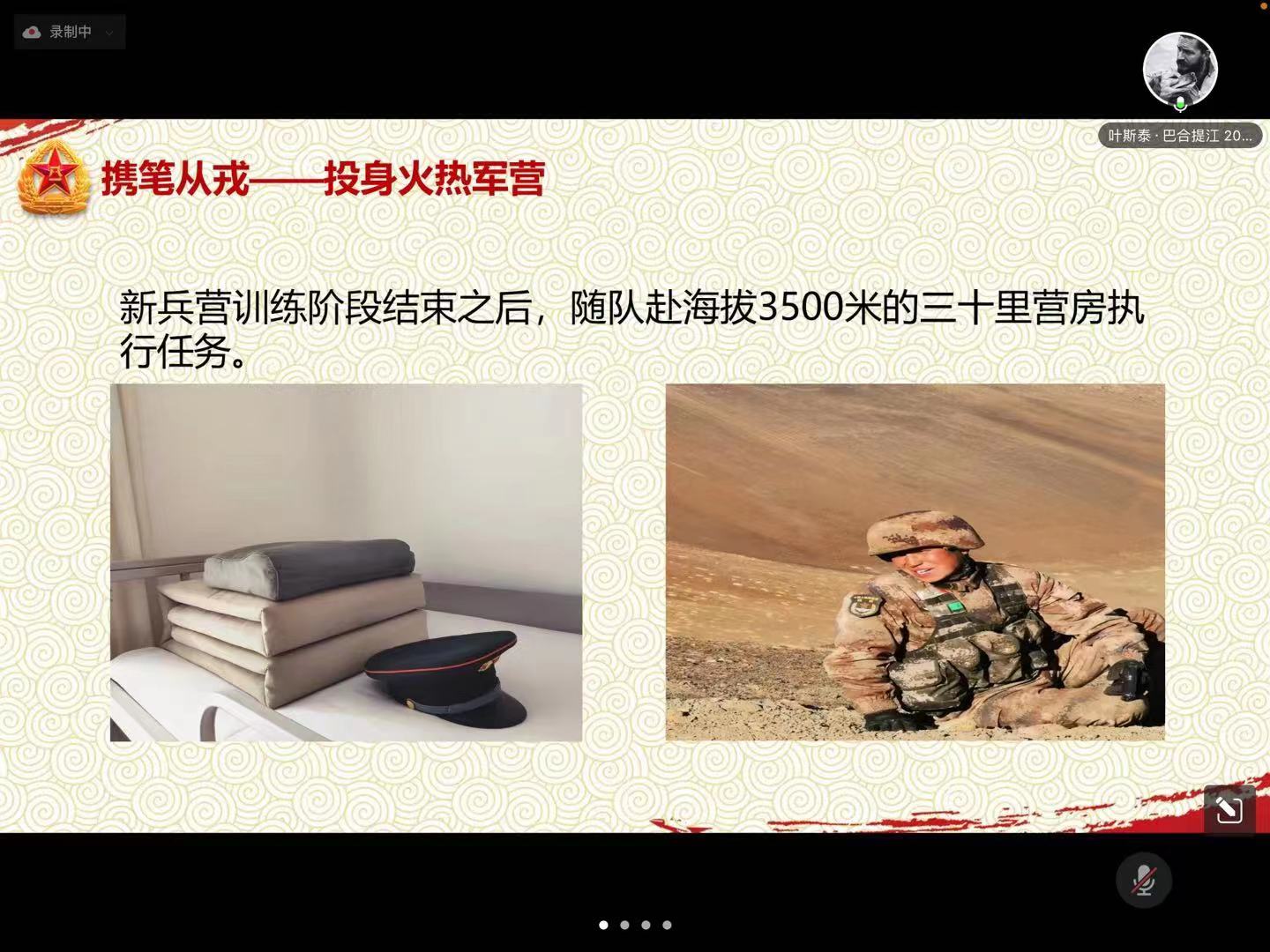 叶斯泰·巴合提江向同学们分享了他的军旅生涯,从“入伍前”“投身军营”“退伍后”三个阶段讲述了自己的参军入伍的经历和心得体会。他表示,军队是一所大公司,在部队的生活让他明白了今天所有的美好都来之不易,参军入伍锻炼了他的意志力和团队意识。同时,他号召同学们积极加入到祖国的国防建设当中,为保卫祖国和人民安全贡献力量,为祖国的国防事业增添一份广外力量。
