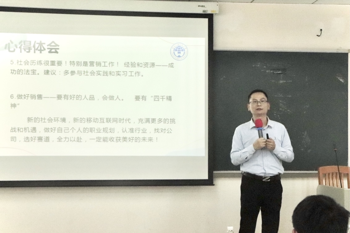 2007届员工,现广东粤奇胜电气科技发展有限公司工程事业部销售总监杨宝坤,受邀开展此次主题为“直击职场——揭开‘销售’的朦胧面纱”的讲座。