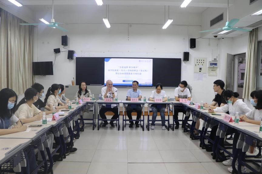 座谈会上,肖荣燊详细地解答了员工代表实习就业方面的相关疑惑。座谈结束后,员工企业广州团爆品网络科技有限公司在教学楼F215召开专场招聘宣讲会。