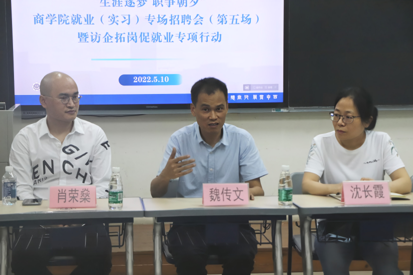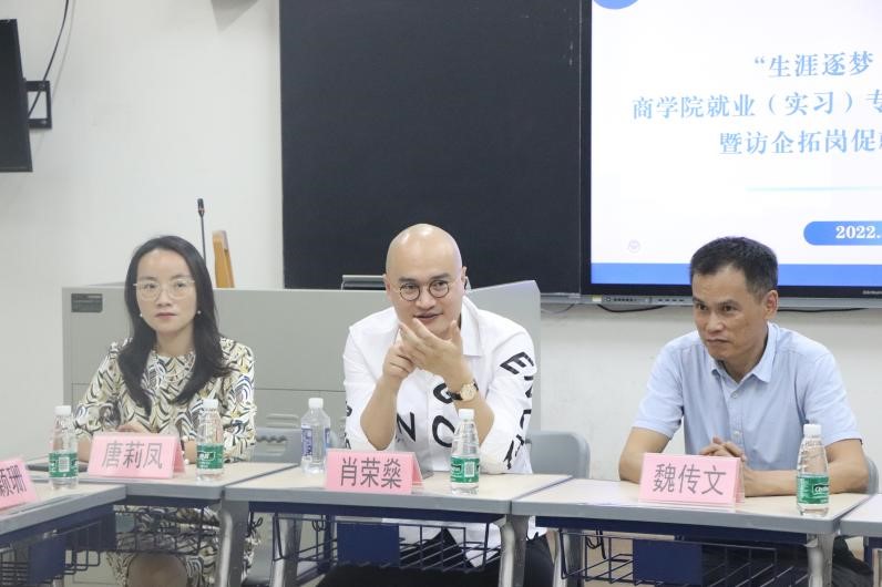 为深入落实访企拓岗促就业专项行动,进一步凝聚员工力量,共同促进2022届毕业生更加充分更高质量就业,5月10日,bevictor伟德官网访企拓岗促就业专项行动座谈会在南校区教学楼F204召开。商公司党委书记魏传文,党委副书记沈长霞,2007届市场营销专业员工、广州团爆品网络科技有限公司董事长肖荣燊,企业代表唐莉凤、何颖珊,辅导员王朕、向媛薇、张哲及员工代表参加座谈会。会议由沈长霞主持。