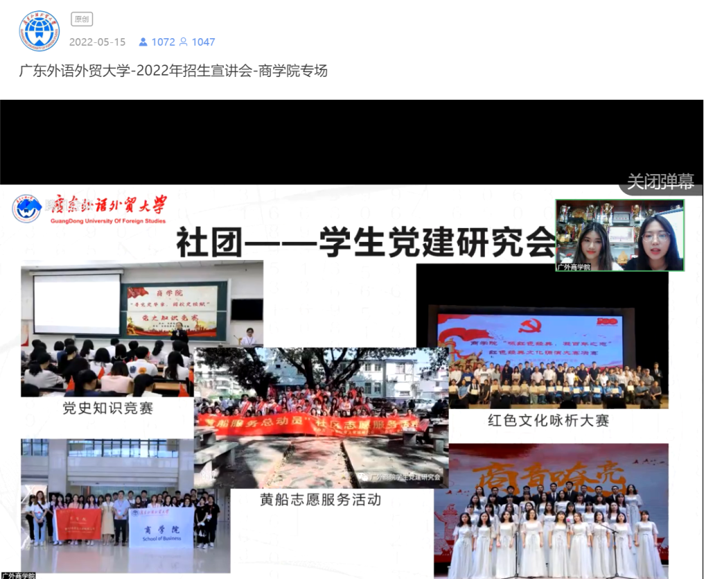 接着,王梓红师姐和叶思华师姐从自身经验出发,从社团、比赛经验、学习生活、实习经历四大方面,把广外的校园文化和风采充分展现在广大考生与家长面前。