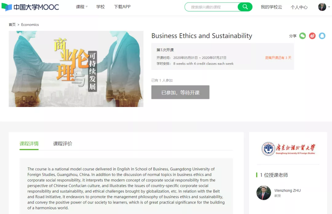 “国际平台上线的“商业伦理与可持续发展”课程以朱文忠教授主讲的国家级视频公开课为依托,考虑到国际学习者的情况进行精心设计,除全英讲授一般性商业伦理和可持续发展话题以外,本课程还结合“一带一路”倡议与国别企业社会责任、中国传统儒家文化与企业社会责任、全球化与商业道德挑战等问题展开讨论,致力于培育学习者的社会责任感和可持续发展理念。在加快在线教学“新鲜感”向“新常态”转变的形势下,课程展示了“中国质量、世界水准”的在线开放课程成果。