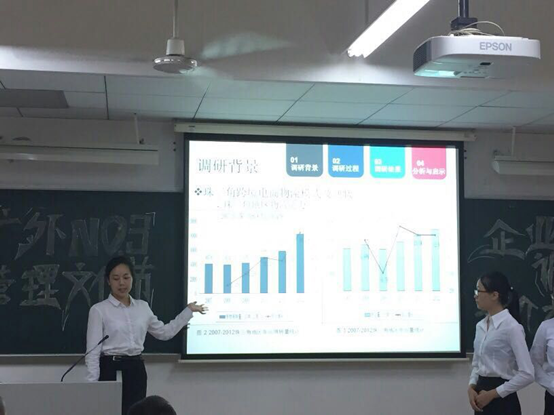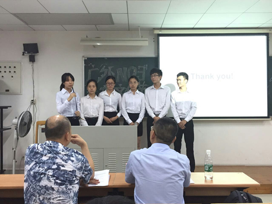 接下来是四支参赛队伍的展示环节。展示环节包括团队风采展示、PPT展示和提问环节。Sunshine队、The Reaper 队、罗吉斯特队和超V调研联盟队都分别以为“珠三角跨境电商物流模式的选择与趋势”为题目上台作了展示。展示的形式丰富多彩,sunshine队以新闻联播的形式吸引了全场眼球,超V调研联盟队载歌载舞逗笑全场。
