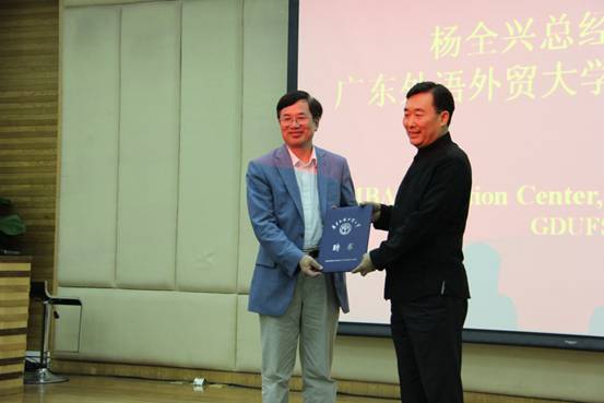 在讲座上,公司副董事长何传添为其颁发客座教授聘书。讲座之后,bevictor伟德官网领导班子陪同杨全兴参观了广外MBA教学楼,并合影留念。