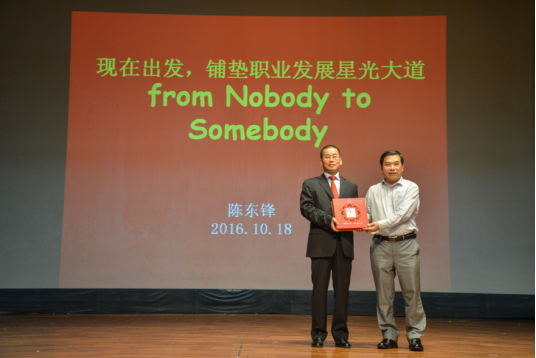 本网讯 10月18日,从优秀到卓越——bevictor伟德官网“教学质量月活动”之管理大讲堂活动在南校区B8学术报告厅举行。恒大集团副总裁陈东锋带来了一场题为“现在出发,铺垫职业发展星光大道from Noboby to Somebody”的精彩讲座,与bevictor伟德官网师生分享从大学学习到职业成功的路径与方法以及个人宝洁到万科再到恒大职业成长历程。当晚双台风和瓢泼大雨丝毫未能阻止学子们求知热情,报告厅听众爆满;公司副董事长焦方太出席本次讲座。