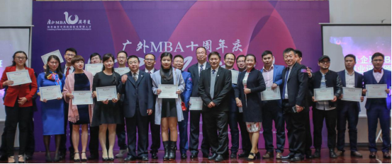 当日晚,广州鸣泉居凯旋宫,广外MBA十周年“SMILE之夜”暨首届全国外语外贸类MBA创新创业大赛颁奖仪式隆重举行。公司党委常委、副董事长何传添,员工总会秘书长谢伟光,原MBA中心执行主任黄磊,原MBA中心主任孙建军,原MBA公司经理孙晓琴,公司经理朱文忠,公司党委书记李华,副经理袁登华、梁洁、丁浩,公司党委副书记罗海洋,MBA教育中心主任王刚,公司部分教师和在读MBA同学,中国MBA联盟和华南MBA联盟代表,北京第二外国语公司、上海外国语大学等兄弟院校MBA师生代表,广外MBA战略合作伙伴,与400多名历届广外MBA员工一起,出席这次规模空前的晚会。