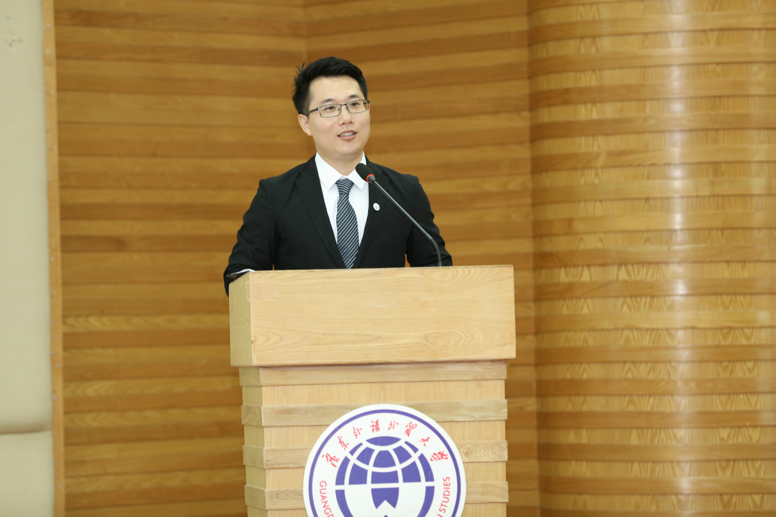 最后,全体同学佩戴校徽,正式成为广外的一员,开学典礼在庄严的校歌中圆满结束。