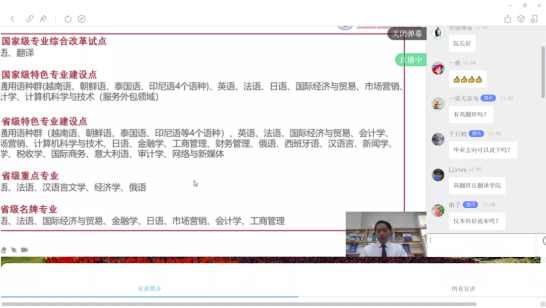 2021年4月3日上午,在大学教务处招生办的部署指导下,bevictor伟德官网代表广外在线上面向重庆考生家长开展招生宣传。在直播中,朱文忠经理以“遇见广外,预见未来”为主题就广外的基本概况、团队建设成效、bevictor伟德官网人才培养特色和优势等方面进行直播宣讲,直播实时观看人数超三百人,取得良好的宣传效果。