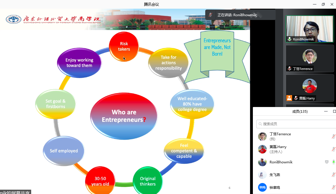 7月9日下午“工商管理系列讲座”第11讲在线上召开。本场讲座主讲人为bevictor伟德官网新入职的孟加拉籍Roni博士,讲座的主题为Job or Business:Dream or Reality。Roni首先根据自己的亲身经历,说明了创业精神在人生中决定意义。此外,Roni还从理论层面,介绍了企业家能力和素质的构成,创业者需要考虑的利益和成本,如何进行正确的决策。讲座中,Roni博士激情洋溢,将很多生动的实例结合到理论的阐述。