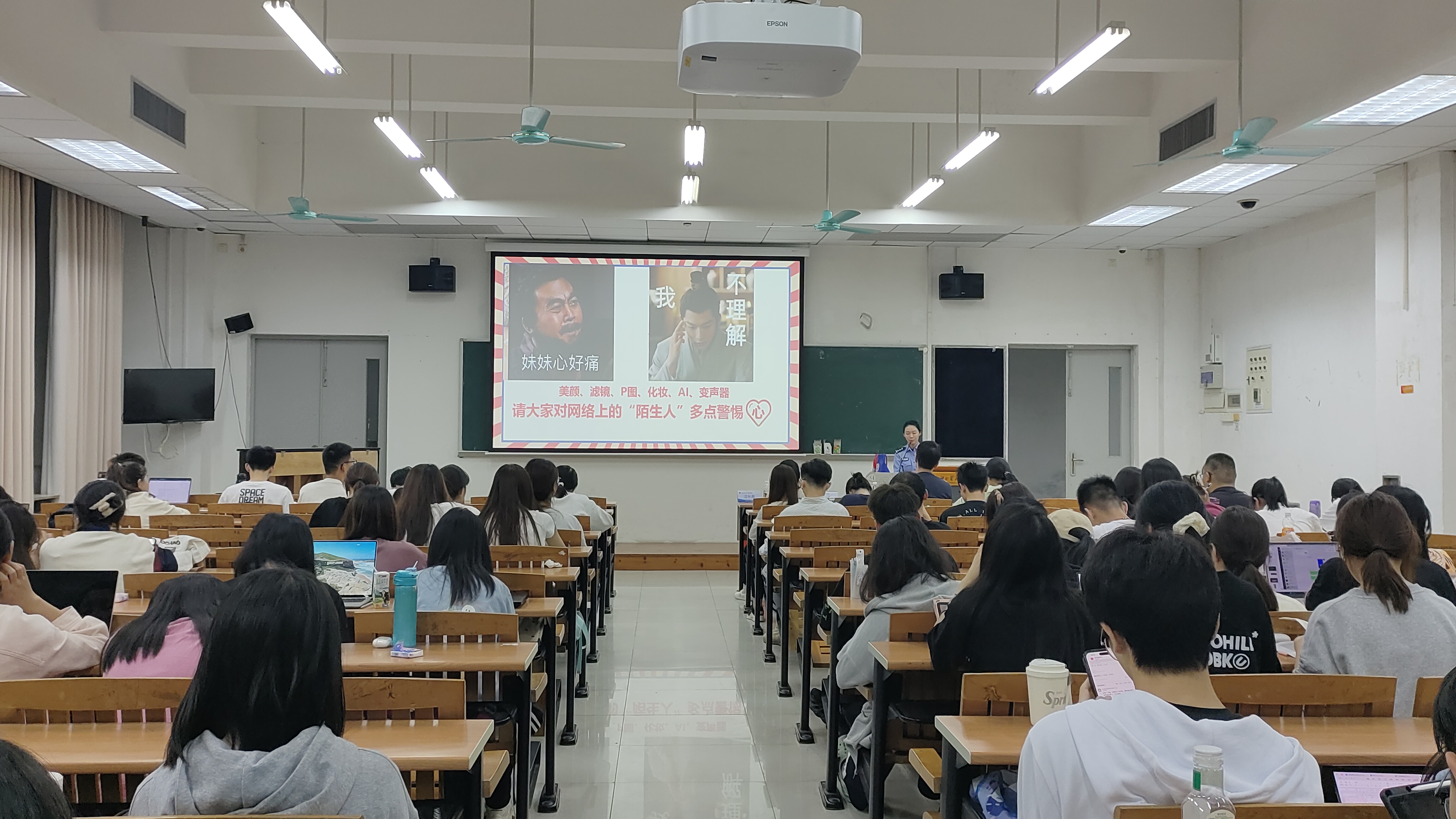 紧接着,庞彦进行了反诈宣讲。庞彦从最近的热点新闻强调我国政府反诈的决心,对诈骗分子进行了有力打击,但电信诈骗仍然常常出现在我们日常生活中,部分原因在于同学们盲目自信,存在观念上的侥幸,让不法分子钻了空子,也直接显示了反诈宣传工作的紧迫性。随后,庞彦罗列出常见的几个电信网络诈骗类型,如刷单,通过刷单获取虚假购物、演唱会骗局和百万保障骗局等。她结合真实诈骗案例,以情景教学的方式让同学们更深刻地理解犯罪分子的诈骗手法,更清楚如何更好地防范电信网络诈骗。最后,庞彦提醒同学们注意网络交友陷阱,不随意点击链接,警惕诈骗电话,远离刷单行为,并强调了反电信网络诈骗专用号码“96110”的重要作用。