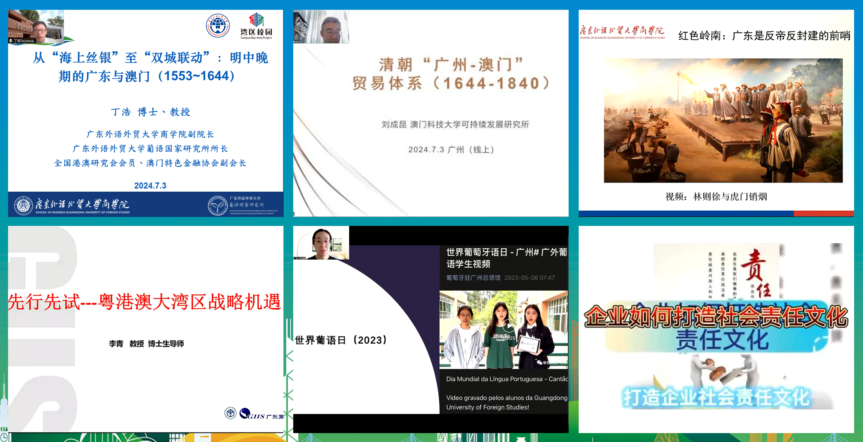 “古港新韵”研修班专题授课内容分为五大篇章,涵盖湾区传统商贸文化知识和新时代商贸文化传承等内容,旨在帮助学员对粤港澳大湾区的历史、现状及未来有更清晰的认知和更深入的理解。丁浩主讲的《“海上丝银”朝贡体系下的澳门与广东(1553-1644)》深入解析了粤港澳大湾区发展规划纲要,强调了区域特色定位与历史传承的重要性,同时探讨了明朝海禁政策与文艺复兴时期欧洲思想解放的对比,以及这些历史背景如何影响现代贸易与全球化发展。通过历史与现代的联系,会议揭示了粤港澳大湾区在全球经济中的战略地位及其在促进区域合作与文化交融中的重要作用。澳门科技大学可持续发展研究所所长刘成昆在《“双城联动”清朝“广州-澳门”贸易体系(1644-1840)》中分析了澳门在全球化进程中的历史角色,揭示了其作为贸易中心的兴衰变迁及其对全球经济的影响。会议还展望了澳门在新时代背景下,如何利用其独特的地理位置和历史文化优势,进一步融入大湾区发展,促进区域经济一体化。张哲在《“变幻频仍”命运多舛的湾区与国家(1840-1949)》深圳的崛起和粤港澳大湾区的协同发展,标志着中国区域一体化和对外开放战略的巨大成功,推动了区域内经济的繁荣和城市间的紧密合作。会议通过回顾中国近代史的重要事件,强调了民族复兴的历程和新时代下粤港澳大湾区在国家发展中的关键作用。广东国际战略研究院秘书长李青教授在《从先行先试至粤港澳大湾区建设》讲座中,通过对粤港澳大湾区概念讲解、发展基础和发展机遇的详尽介绍,令学员深刻感受粤港澳大湾区的巨大发展潜力。西语公司葡萄牙语系系主任尚雪娇的讲座《中国与葡语国家教育文化合作》,通过介绍葡语基本知识、中国与葡语国家教育合作现状、中葡文化交流等内容,丰富了学员们的视野,引发对文化传播与国家形象、文化外交、人才联合培养等的思考。朱文忠在《新时代的湾区商贸文化与企业社会责任》中,从新时代与大湾区、企业社会责任概念出发,引发学员对儒家文化与现代企业社会责任、粤商文化价值观和粤商企业社会责任的思考,让学员认识到企业社会责任在当代商业环境中的重要地位。