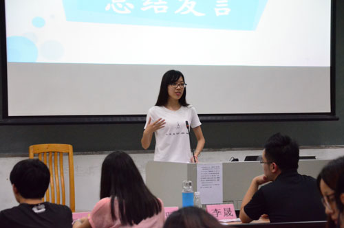 所有班级展示完毕后,谢珮上台进行总结发言。她先是肯定了大家在这一次团日活动中的出色表现,谈到与去年相比今年的内容更加丰富,许多班级都通过自己的解读让活动更有指向性,进步很大。随后,她也指出一些不足之处,如同学参与度不高、PPT字比较多而图比较小、视频取材政治历史敏感性不够等等。同时谢珮也提出了自己的建议并希望大一同学们能够珍惜大学时光,珍惜同窗友谊,让在场的同学们都受益匪浅。