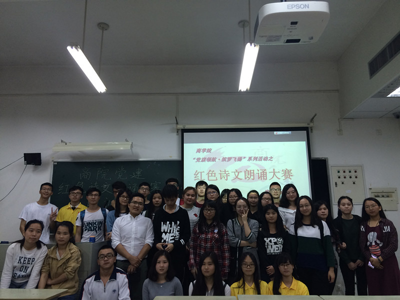 本网讯 3月21日晚上9:30,由商公司党委主办的“党旗领航·筑梦飞扬”系列活动之红色诗文朗诵大赛培训会在教学楼F203成功举行,商公司党建指导老师殷毅山、新闻公司播音主持专业的胡泽南同学以及19支参赛队伍出席了本次培训会。
