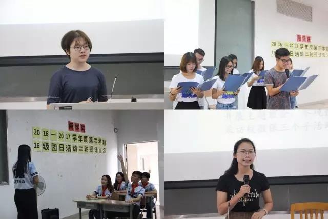 展示在代表发言后正式开始。第一个展示的是工管1609班,他们的团日活动中有歌声、笑声,充满了欢乐与希望。他们坚定“跟党走”与“立德树人”的理念,走访老干部,到芳村义教,为聋哑小孩子带来贴心关怀,希望通过自身的力量,为社会作出一些奉献。接下来的创新1601班在此轮活动中主要围绕创新创业的理念展开。除了回顾邓小平先生在改革开放的事迹,他们还进行了相关辩论赛、企业参观与创业者采访等活动,有趣生动之余,还充分体现了创新精神。而创新1602班则更注重党与社会的发展史,开展了“四史”知识竞赛,还到贝岗村进行垃圾拾取行动,体现对社会的关怀。