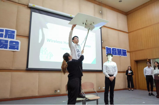 接下来展示的“轻净”团队关注于家政清洁行业,在广告中用日常生活中的具体情景为大家展示了团队的清洁产品。在讲介环节,该团队首先通过现场的情景演绎突出产品的实用性,并且在英文讲介环节,流利顺畅的对产品的优势、定价、市场等方面进行了详尽的推介。在答辩环节,评委们对产品的广告、产品自身材质、产品价格、市场竞争方面进行了提问并且给出了相关建议。