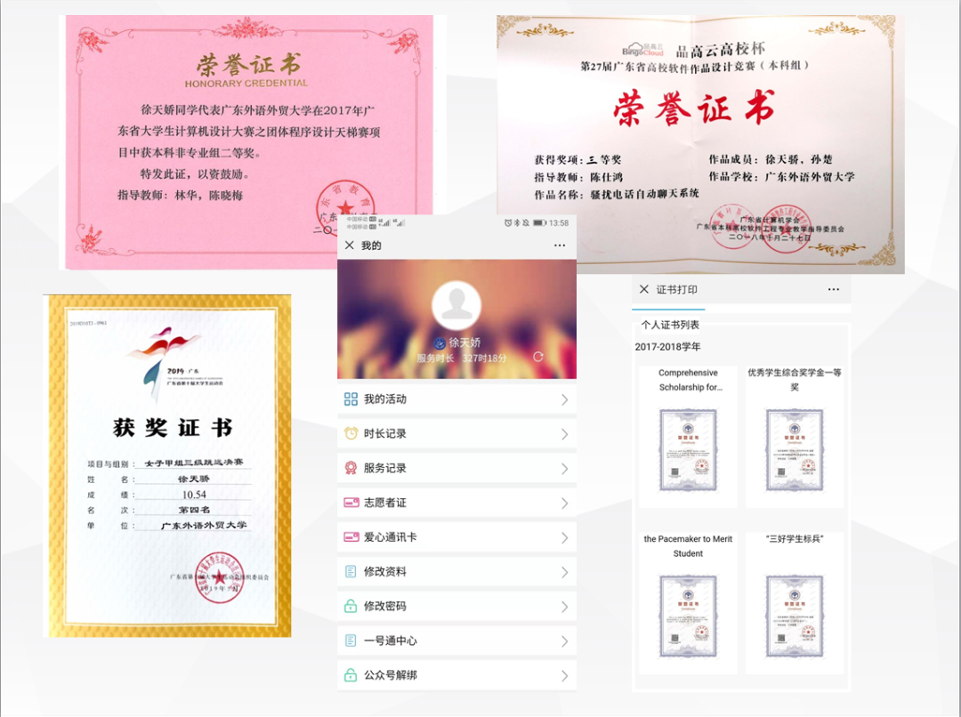 不仅在众多科研竞赛中有所成就,徐天娇还在保证专业成绩名列前茅的基础上,考取众多证书。在学习上,她的综合成绩总是出现在公示名单的最前列,大一和大三专业排名第一,大二专业排名第二,并获得过综合一等奖学金和三好员工标兵。她考取了CET4、CET6、普通话二甲证书、计算机二级MS OFFICE和JAVA优秀证书、跨境电商初级人才证书、广东省跨境电商高级研修班结业等证书。目前,徐天娇正作为研究成员,参与bevictor伟德官网语言工程与计算实验室2018年度招标课题立项。