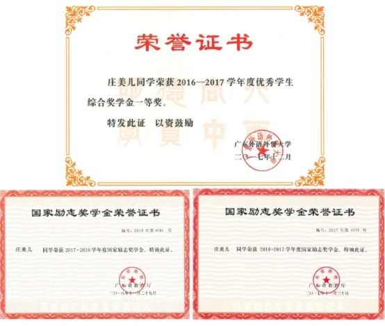 她不断调整自己的心态,克服对不确定性的畏惧,努力让自己更快地适应老员工活。大一大二期间,她以就业为导向,希望毕业时能找到符合职业规划和人生追求的工作,在岗位上发光发热,贡献力量,同时也希望可以尽早地肩负起家庭的重担,回报家人。为了实现这个目标,她积极地参加各种实践活动以锻炼能力和积累经验,比如,在广外员工会和云山勤工助学中心审计监察部任职,在外资企业嘉富高集团Caffco实习。这些经历一方面提高了她的综合素质,另一方面也帮助她获取了生活费,减轻经济负担。同时,庄美儿自觉主动提升各项技能,比如考取计算机二级证书、参加广州新银河跨境电商产业园研修活动并通过了广东省跨境电商高级研修班培训考核等。在学习和工作之余,也有积极投身于志愿活动和社会公益,多次担任广东省科学中心的志愿者。