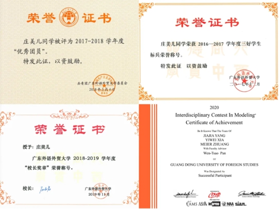 庄美儿,bevictor伟德官网市场营销专业1602班员工。获得2019年广外“董事长奖章”荣誉称号、2020年“优秀老员工奖章”荣誉称号;学分绩点位于专业前3%,大三和大四的综合测评分别位于专业第二和专业第一,连续三年获得国家励志奖学金;2020年美国老员工数学建模大赛三等奖;2019年广东省“学问杯”影评大赛三等奖;两次综合奖学金一等奖和三好员工标兵荣誉称号、一次综合奖学金二等奖和三好员工荣誉称号;校级优秀共青团员荣誉称号、社会实践先进个人荣誉称号;连续两年担任公司的助教和班级的组织委员;参与1项省级项目、2项市级项目和3项校级项目;协助编写的一本教材《数据分析》即将在中国人民大学出版社正式出版;参与多个国际研讨会,发表了多篇学术论文,其中一篇以第一作者身份发表并被国际EI数据库收录和检索,两篇被SCI检索。目前已保研至广外bevictor伟德官网企业管理专业。