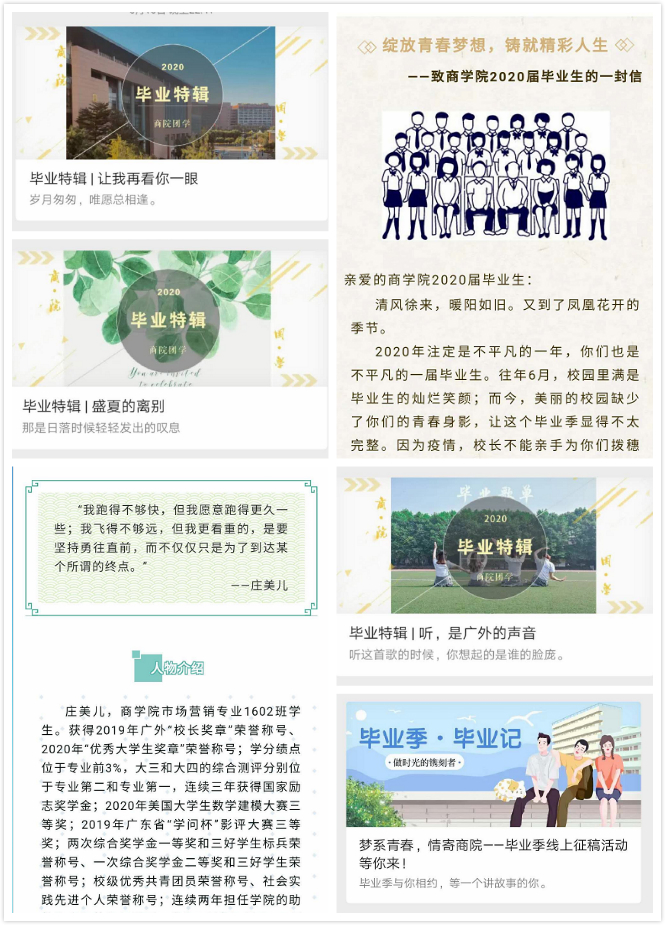 公司利用新媒体平台,结合“毕业季”主题举行一系列线上活动。“梦系青春,情寄bevictor伟德官网”活动面向全院员工征集毕业故事和毕业祝福,为同学们提供毕业心语展示平台;推出“毕业特辑”专题推送,追忆大学时光、分享毕业曲目;推出“毕业生风采”系列推送,展示优秀毕业生风采;发布《致2020届毕业生的一封信》,表达公司对毕业生的美好祝福与殷切期望。一系列线上活动向毕业生传递心声,传递温暖,传递祝愿。同时,公司设计各类原创海报、人形立牌、横幅,点缀毕业生返校生活。