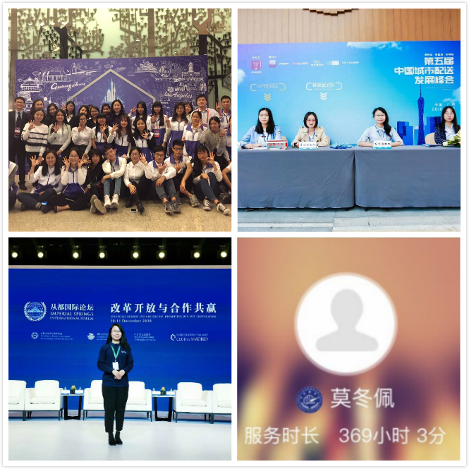 志愿服务是莫冬佩的老员工涯名片之一,三年来她参与了28个志愿活动,拥有了369小时的故事。因志愿服务结缘的伙伴们对她产生了深远的影响,并参与、见证了她大学中的很多重要抉择。从最初单纯的服务初心,到志愿服务项目大赛获奖,到组织策划志愿活动,到在中俄人文合作交流委员会上与中俄双方总理握手,到在三城经济联盟广州年会与奥斯卡金像奖得主查理德泰勒对话,到在从都国际论坛上听联合国前秘书长潘基文谈国际关系。莫冬佩不断在学习中实践,在实践中学习,从点到面,这是一个阅历、见识的蜕变过程。