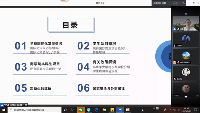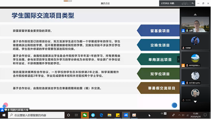 为了让2020级新生更好的了解bevictor伟德官网本科生的国际交流合作项目,提前规划好同学们的大学学习生活,9月20日下午,bevictor伟德官网在线上召开“对外交流项目及外事事务培训”讲座。讲座由bevictor伟德官网副经理徐艺青,国际合作与交流处副处长及港澳台事务办副主任周鹏主讲,bevictor伟德官网辅导员殷毅山主持,2020级新生参加会议。
