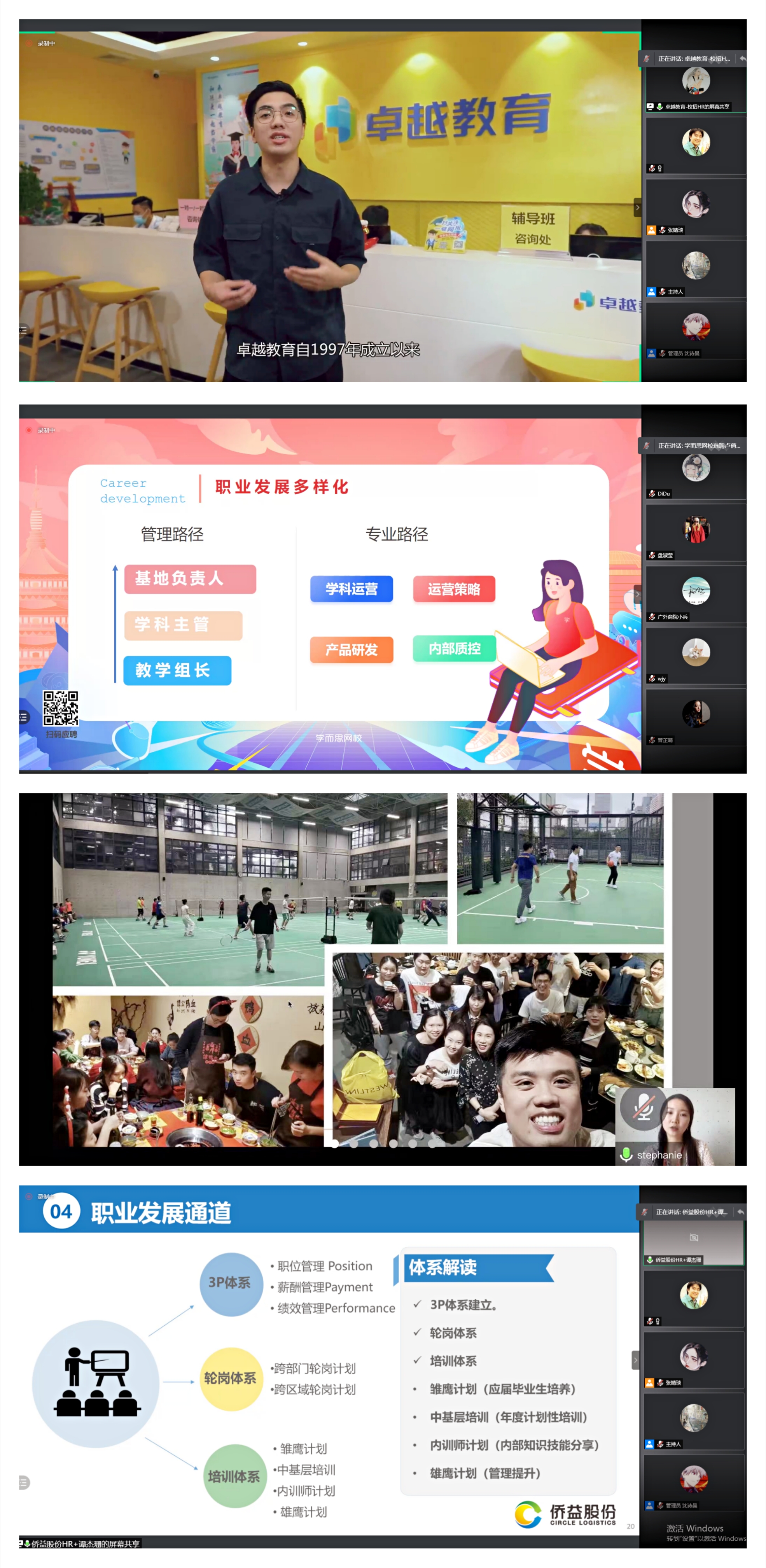 各招聘企业结合当前在校老员工需求与企业实习岗位需求进行企业宣讲并有针对性的进行老员工职业生涯规划、就业求职能力提升等经验分享与指导。碧桂园“智慧生活,定义未来”的价值理念让同学们对碧桂园的核心文化观念有了具体理解;学而思网校为同学们分析了在线教育在后疫情时代的新发展,让员工们了解到在线教育存在的机遇和挑战;猎聘在宣讲过程中分析了中国人力资源服务市场的现状,让同学们了解到随着中国的发展,知识复合型人才将越来越受到市场青睐;欢聚集团从跨境电商大趋势讲起,并分享了国内跨境电商先行者与欢聚集团旗下的SHOPLINE发展计划;KOS集团负责人结合自身经历,为同学们介绍了企业品牌故事,帮助同学们更好的规划自己的职业生涯。