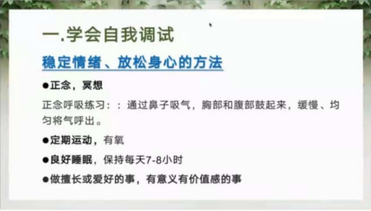 为有效缓解新生入学的压力和焦虑情绪,使他们认识到新生入学心理健康的重要性,夫之秋老师开展了新生入学心理健康讲座。她分四点讲述了开展新生入学心理健康讲座的必要性,随后详细介绍了入学后可能会面临的三个问题,分离焦虑、繁杂的任务和挑战性目标、不确定性环境和作息与人际关系。同时,她指导同学们应该如何评估心理健康,运用合理合适的方式去缓解压力,在遇到心理问题时要积极寻求必要的心理咨询。