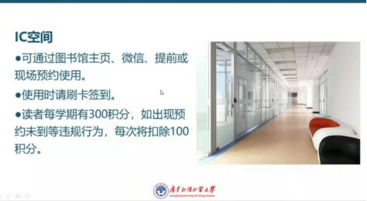 随后,她介绍了图书馆丰富的资源,其中不仅包括校内资源,更有丰富的校外资源供同学们使用。其次,张爱优向同学们详细介绍了高效灵活运用图书馆资源与服务的方法,如注册公众号、公众号的作用、人脸注册、刷卡入馆、新生闯馆、书目检索及IC空间的使用方法等等。