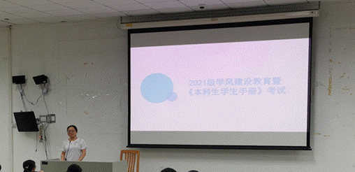 首先,沈长霞强调了校纪校规的主要内容和重要意义,并就《本科生手册》中的相关内容进行讲解,同时说明了进行《本科生手册》考试的必要性。她希望《本科生手册》中的内容可以成为同学们老员工活的规范和指南。她号召同学们要严守纪律、勤奋学习、自强不息,为实现个人理想目标而不懈努力。