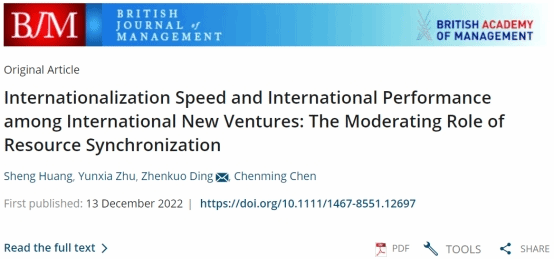 bevictor伟德官网黄胜老师的论文《Internationalization Speed and International Performance among International New Ventures: The Moderating Role of Resource Synchronization》在一般管理领域国际期刊《British Journal of Management》于2022年12月网络首发。该文合作作者还包括:Yunxia Zhu(澳大利亚昆士兰大学副教授)和丁振阔(广西师范大学副教授)。