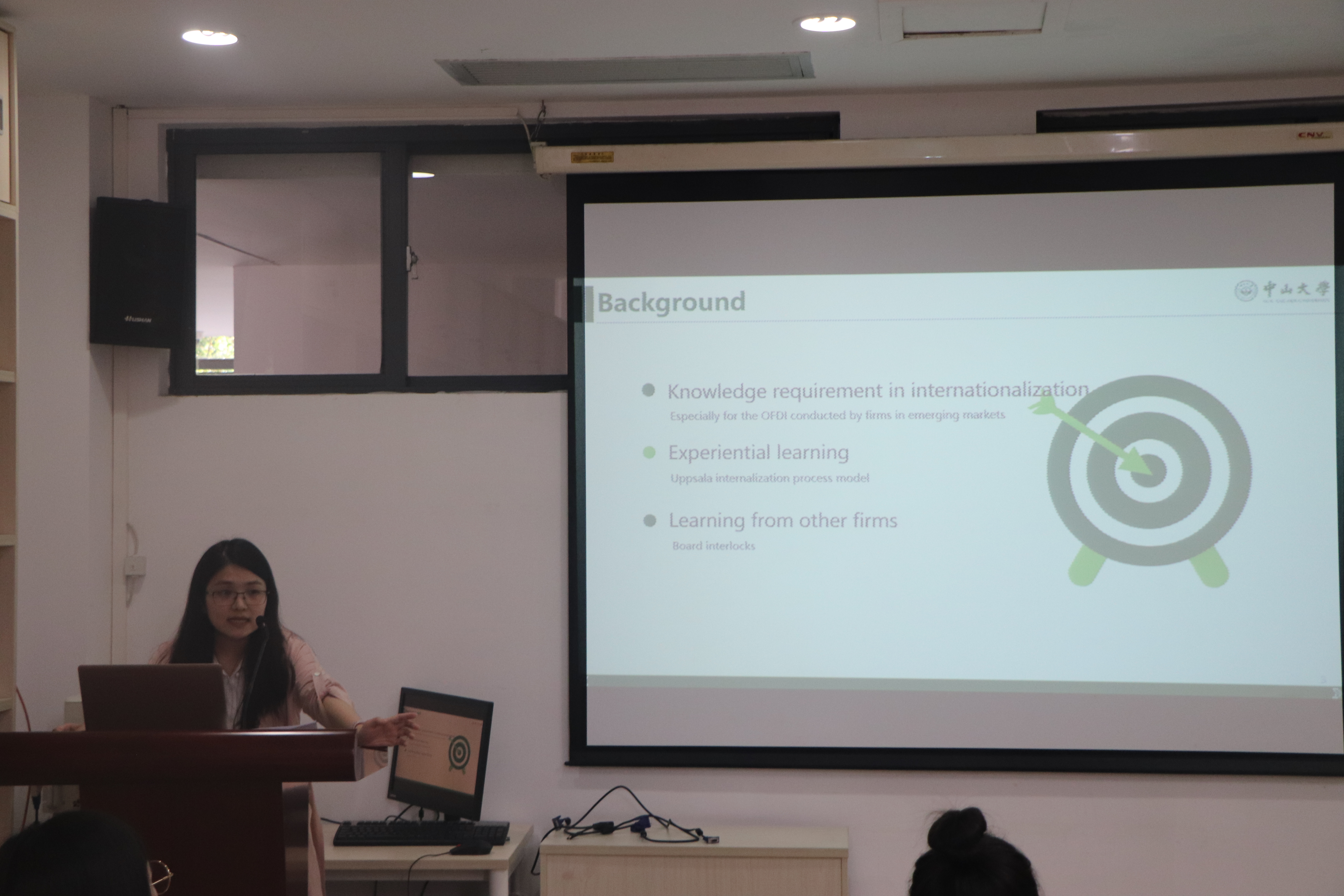 首先,朱紫嫣老师分享题为《Board Interlock Tenure and Firm Internationalization》的研究。连锁董事(Board Interlock)是指在两家以及两家以上组织同时任职的董事,企业广泛存在着连锁董事现象,并对企业生存与发展产生深刻的影响,尤其是连锁董事对于组织所需的外来知识流入以及组织学习发挥至关重要的作用。