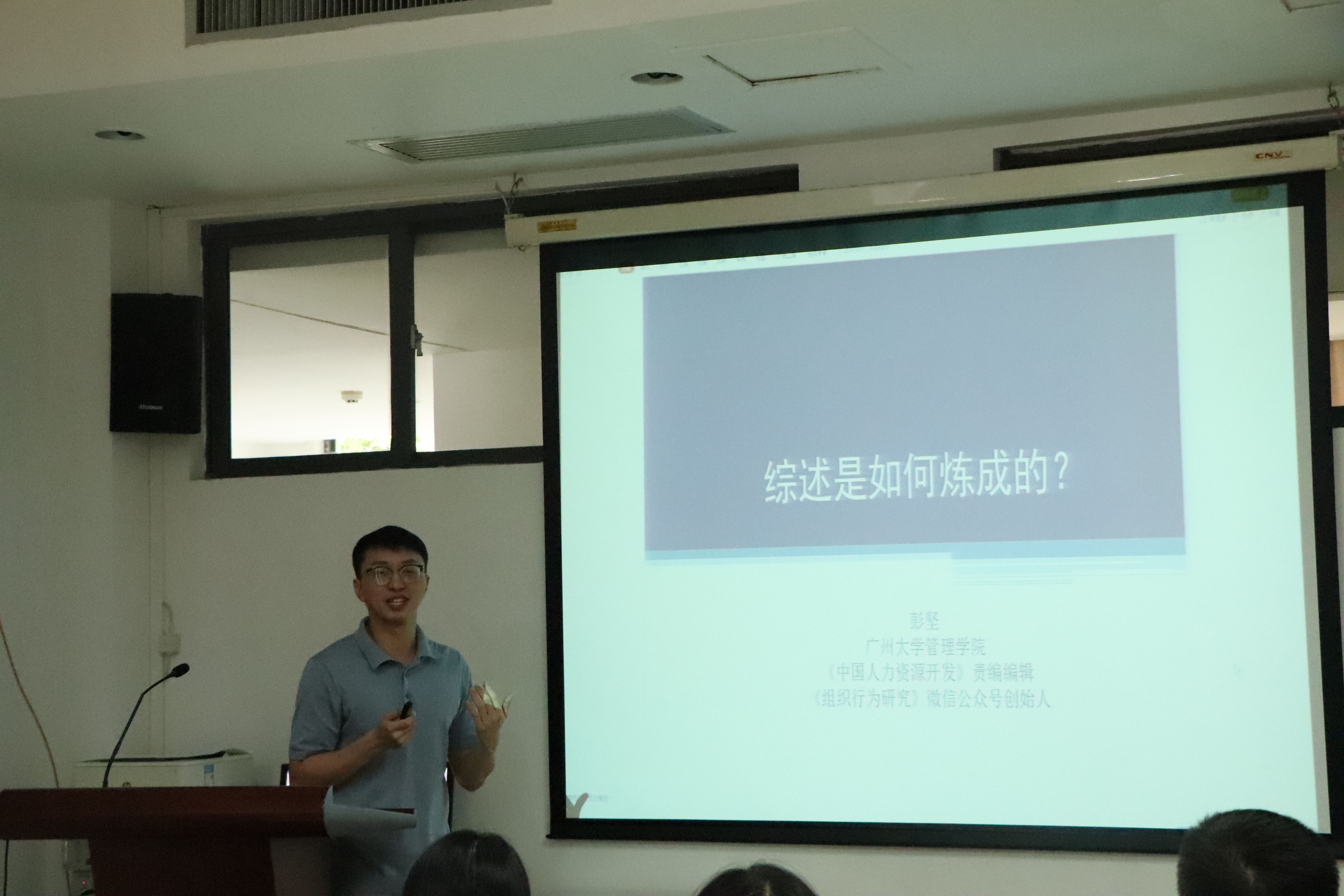 紧接着,广州大学管理公司副教授彭坚老师为在座师生带来了干货满满的文献综述写作分享。彭坚老师有着丰富的综述写作经验,并善于总结和归纳,他首先为大家介绍了文献综述的类型,并依次讲解了特定类型下的论文框架模板,接下来彭老师就以具体的文献举例,深入浅出的为大家介绍文献综述主题文章的五步写作大法。