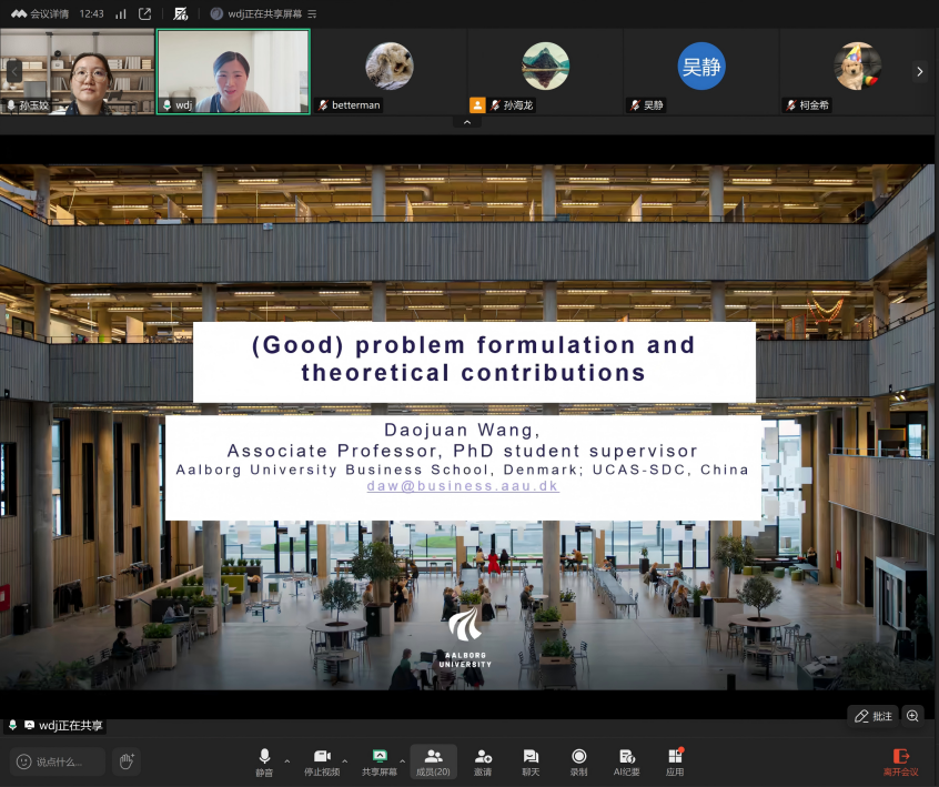 2025年10月22日下午,“六秩风华 商约未来”商学系列讲座之“学术大讲堂”第12期通过腾讯会议顺利举行。丹麦奥尔堡大学bevictor伟德官网副教授、博士生导师王道娟应邀主讲,围绕“(Good) Problem Formulation and Theoretical Contributions”展开分享,为师生呈现了一场兼具国际视野与学术深度的讲座。讲座由公司研究生办公室副主任孙玉姣主持。