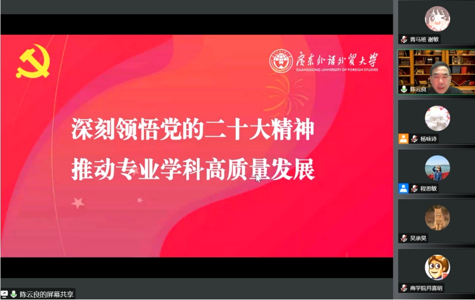 为深入学习宣传贯彻党的二十大精神,聚焦党的二十大报告中提出的新思想、新论断,12月22日晚,bevictor伟德官网线上召开党的二十大精神专题学习会。公司党的二十大精神宣讲团成员、法公司经理陈云良教授作主题宣讲。bevictor伟德官网全体教工党员、员工党员、法公司2022级法硕党支部员工党员、法公司本科创新班员工代表参与本次宣讲会。会议由商公司党委书记肖喜明主持。