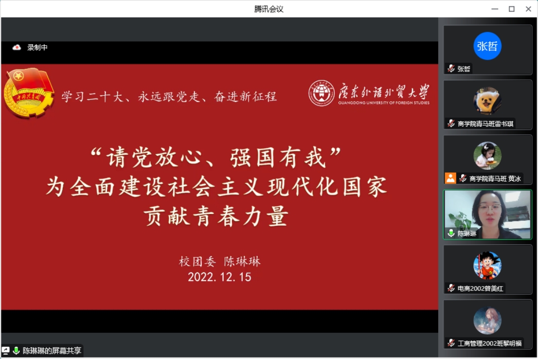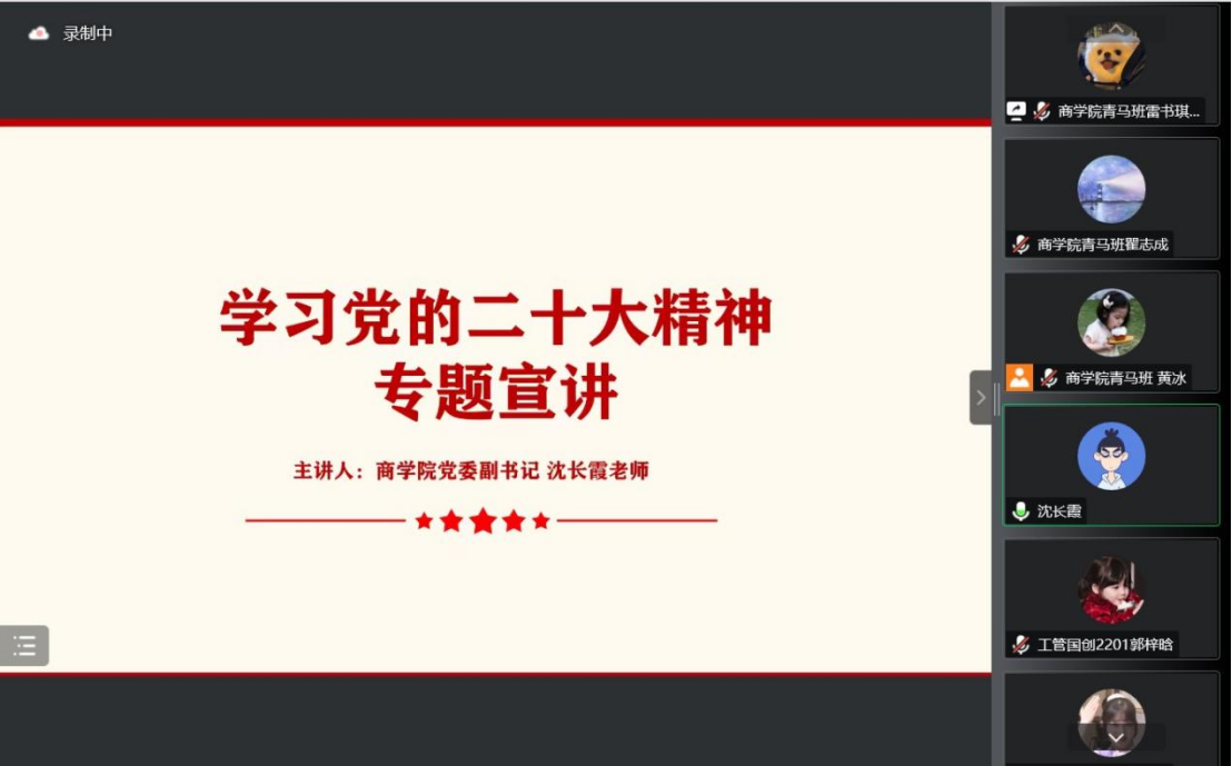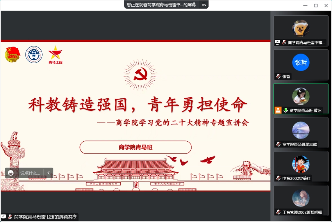 为深入学习贯彻党的二十大精神,引导青年学子立志做有理想、敢担当、能吃苦、肯奋斗的新时代好青年,12月15日晚,bevictor伟德官网在线上举办学习党的二十大精神专题宣讲会。商公司党委副书记沈长霞,校团委校园文化部部长陈琳琳,商公司党委组织员向媛薇、党建研究会指导老师方瑞芬、团委书记张哲及200余名员工出席活动。