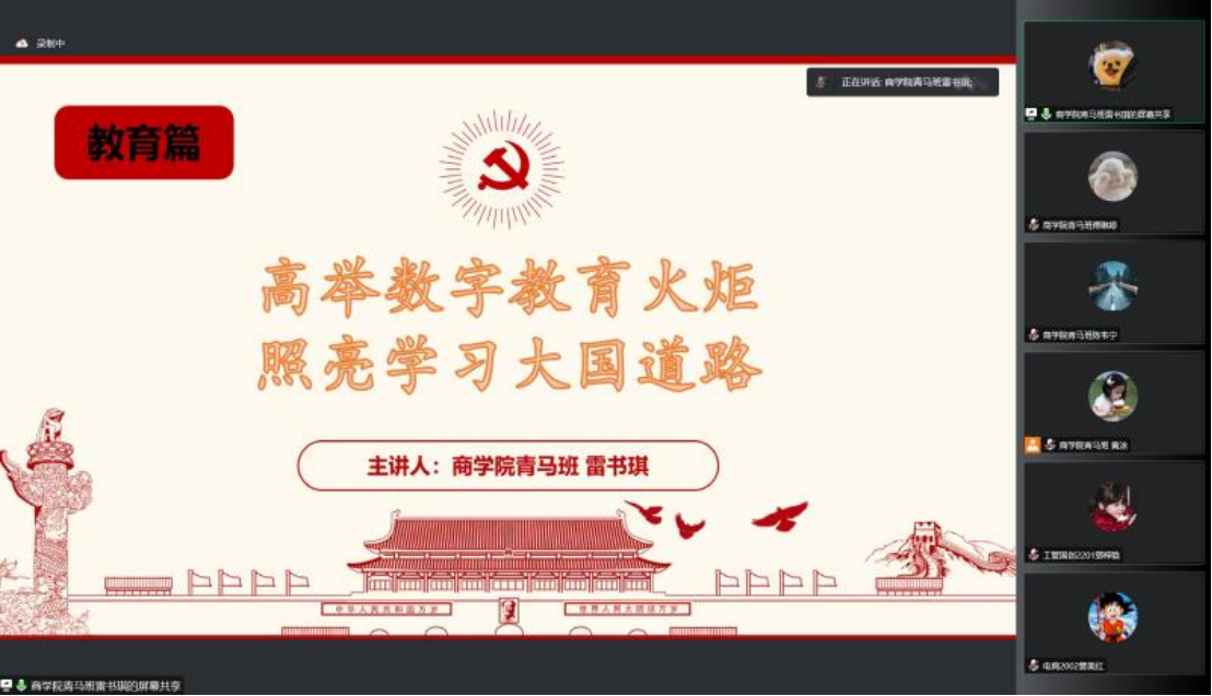 雷书琪以“高举数字教育火炬,照亮学习大国道路”为题,她通过解读党的二十大报告中关于教育事业的相关政策、分析上海静安教育数字化转型的现实案例等板块循序渐进地为同学们进行展示。以教育数字化为线索,用理论联系客观实际,并论述了教育数字化转型大背景下新商科的建设以及作为商科学子的使命与方向。