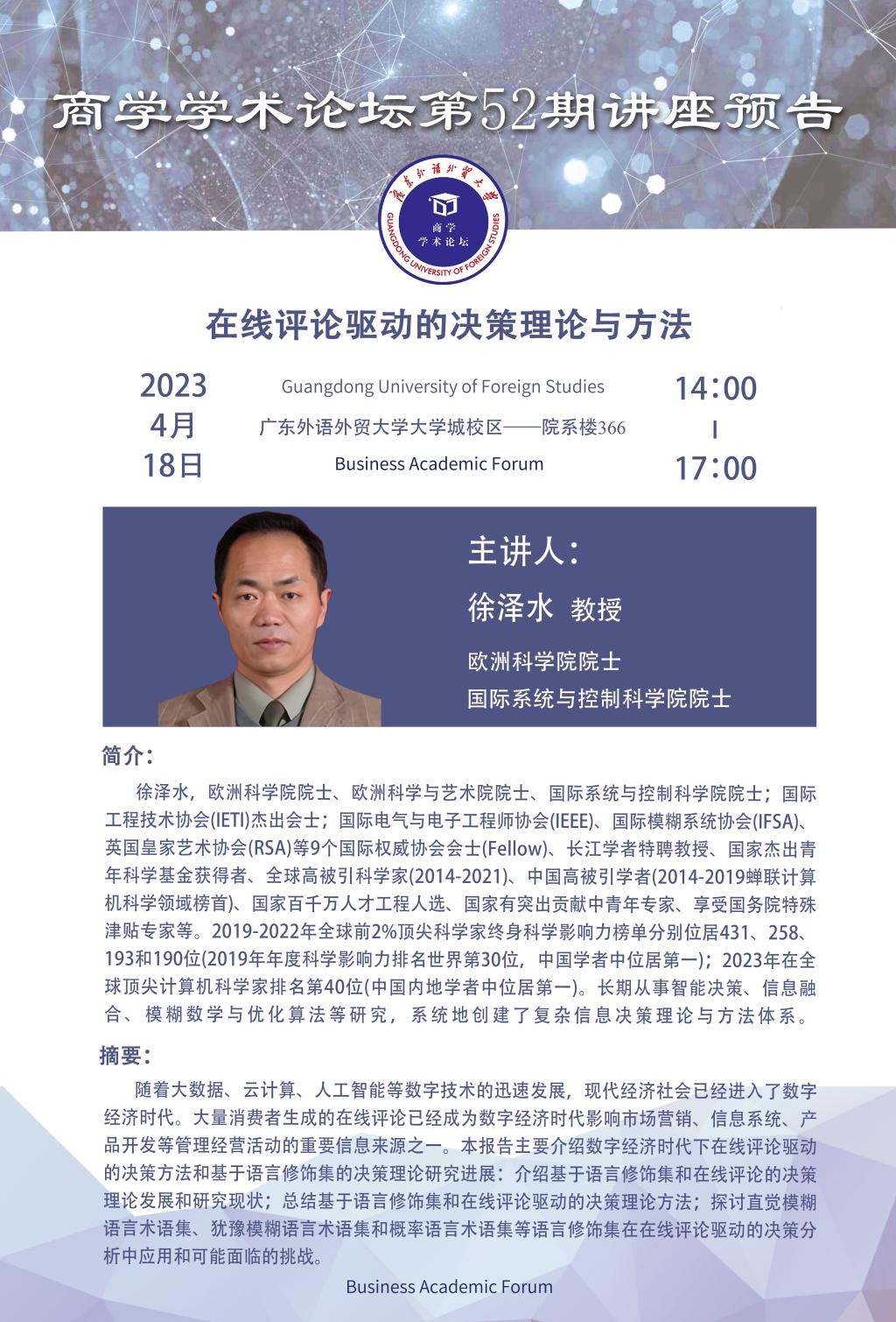 商学学术论坛第52期讲座预告:在线评论驱动的决策理论与方法